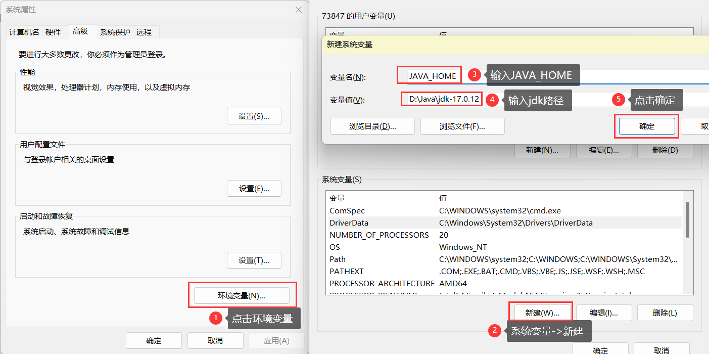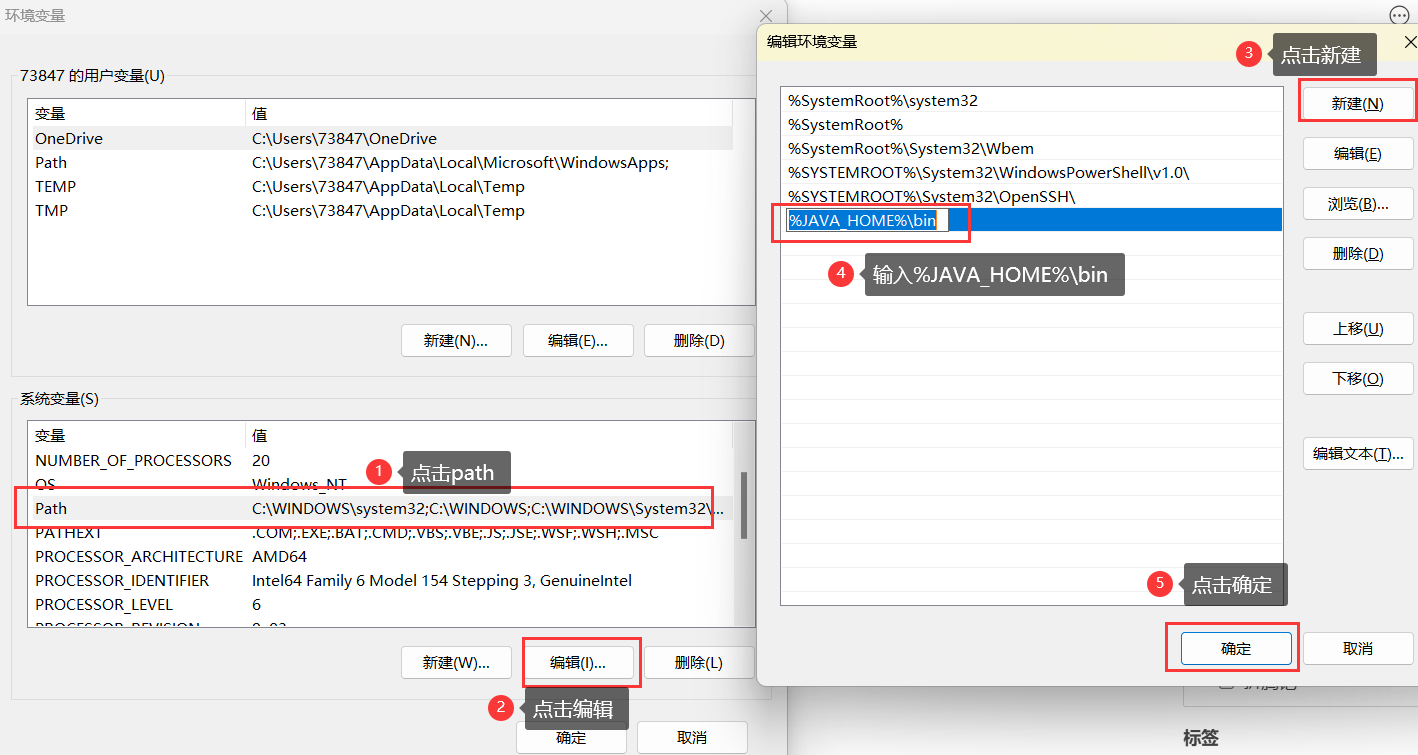 1、打开右击此电脑->属性->系统 2、系统->相关链接->高级系统设置3、环境变量->新建(系统变量)->输入变量名(JAVA_HOME)->输入变量值(本地jdk路径)4、点击系统变量(path)->编辑->新建(编辑环境变量)->输入 %JAVA_HOME%\bin ->点击确定->确定5、验证配置:按windows+R键打开运行->cmd->输入java -version->回车6、看到版本号就是配置成功